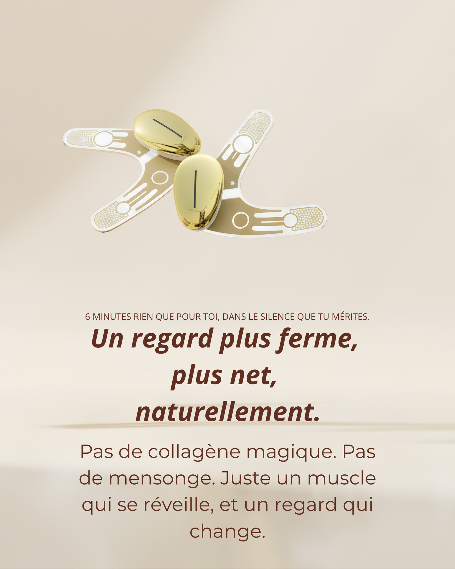 Ce sont des patches technologiques qui utilisent des micro-courants (EMS) pour stimuler les muscles du contour de l’œil. Contrairement aux patches classiques, ils agissent en profondeur pour lifter, raffermir et lisser la peau naturellement.
