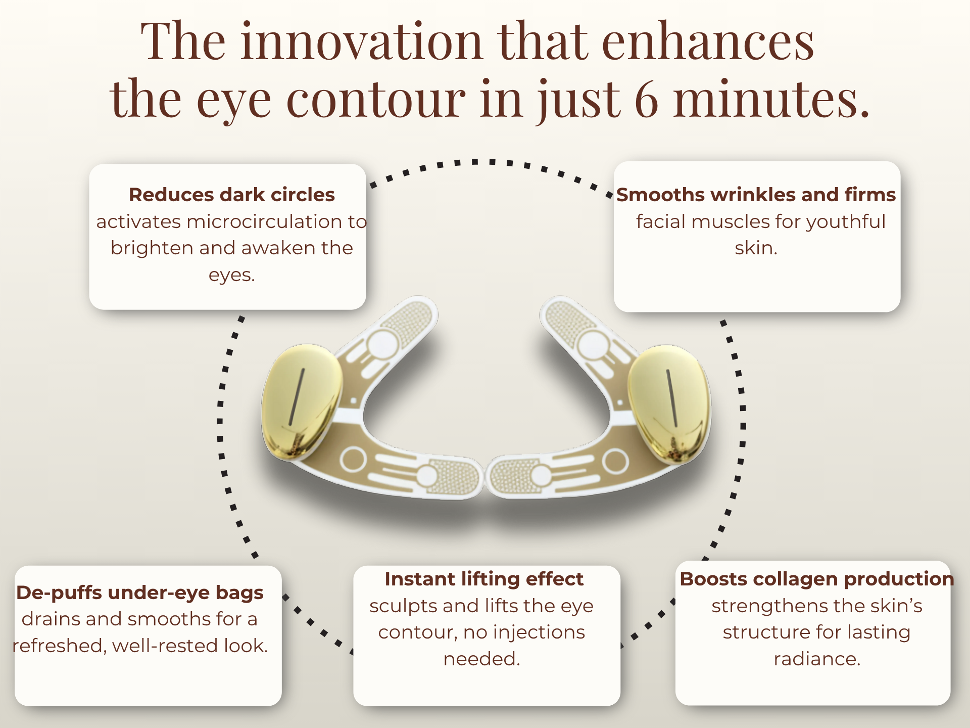 Conçu avec la technologie micro-courants de nouvelles génération, notre dispositif agit sur le coeur des muscles et des cellules pour raviver l’éclat et redonner fermeté au contour de l’oeil. Chaque impulsion douce relance la production naturelle de collagène et améliore la micro-circulation.